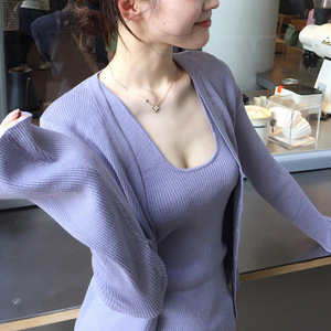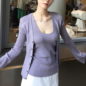 针织开衫外套女秋季长袖薄款挂脖背心紫色设计感两件套装2025新款