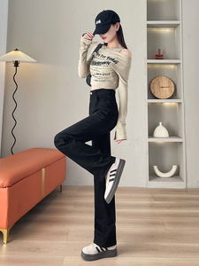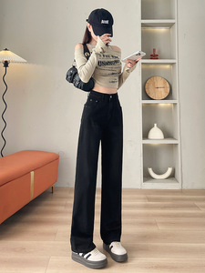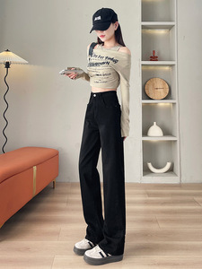 黑灰色直筒牛仔裤女春秋季高腰烟管长裤显瘦宽松拖地窄版阔腿裤子