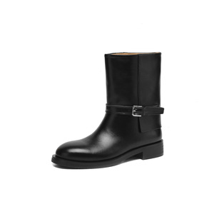 法式简约复古牛皮西部靴2025秋冬粗中跟圆头皮带扣真皮套筒短靴女