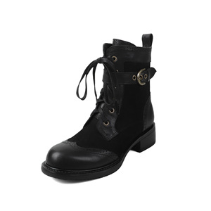 英伦风头层牛皮拼接马丁靴2025冬粗中跟镂空皮带扣真皮系带短靴女