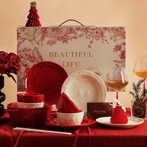 【锦盒装】红白混搭蝴蝶结餐具13件套-(4碗4盘)