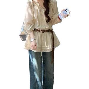 法式温柔边抽绳衬衫夏季女纯欲甜美风长袖防晒衬衣上衣小个子