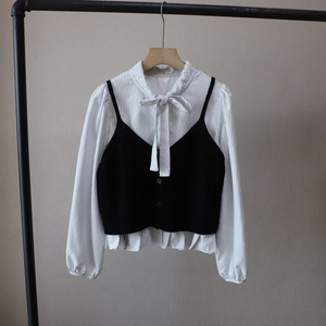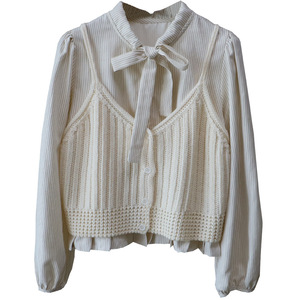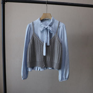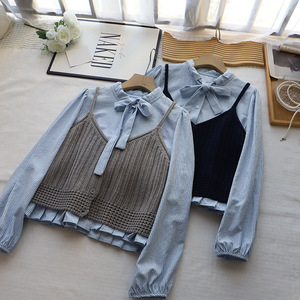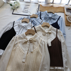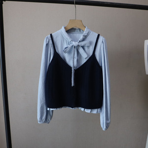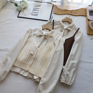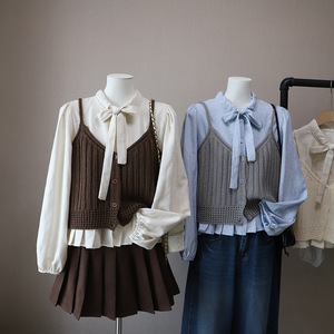 [比正]2025秋季新韩版甜美蝴蝶结条纹衬衫外搭针织马甲背心女5091