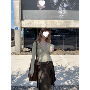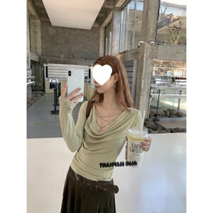 红人馆长袖打底衫女早秋巨好看的2025新款修身t恤设计感荡领上衣