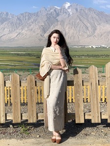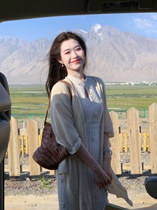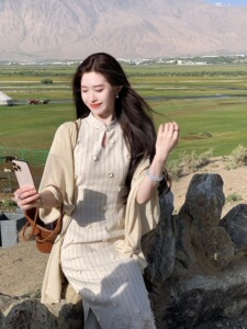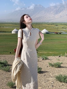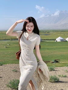 凌茜恣禾【牧云】新中式棉麻条纹改良旗袍早秋蕾丝拼接连衣裙