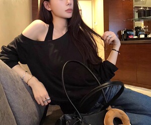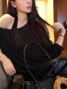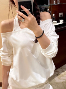 SUNONEON 天丝挂脖宽松慵懒斜肩卫衣女秋季新款美式长袖套头上衣