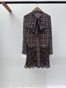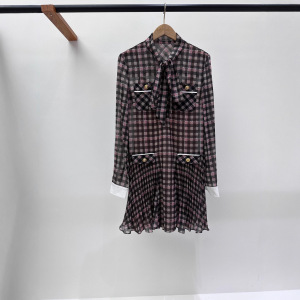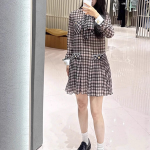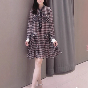 法式2025秋冬新款格纹减龄通勤系带蝴蝶结雪纺宽松百搭长袖连衣裙