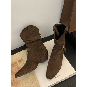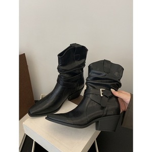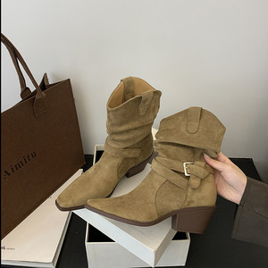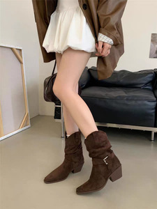 法式复古短靴女2025新款西部牛仔靴女粗跟尖头中筒堆堆靴短靴