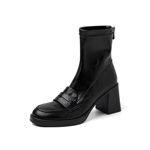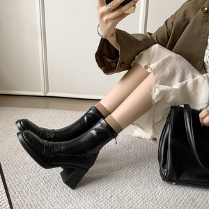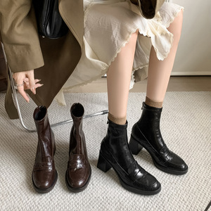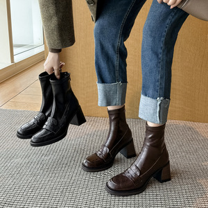 静音底英伦风瘦瘦靴2025秋冬圆头粗高跟羊皮弹力拼接短靴女42大码