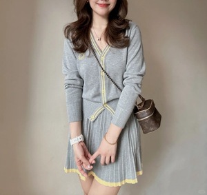 秋季穿搭一整套高级感温柔风小香风灰色V领针织开衫百褶裙两件套