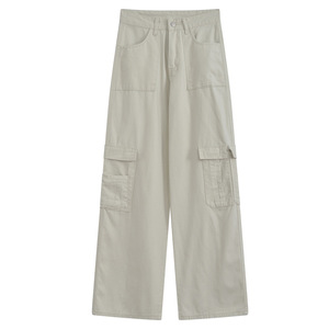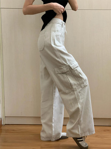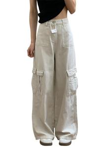 杏白色阔腿牛仔工装裤女秋季新款美式复古宽松显瘦休闲直筒长裤子