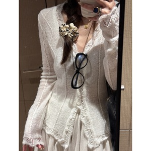 跨境OHLABABY 马海毛镂空花边针织开衫女外套早秋轻薄腰显瘦V领衣