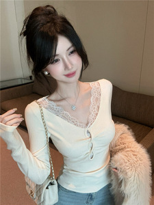 韩系纯欲蕾丝拼接长袖t恤女秋季假两件镂空修身显瘦内搭短款上衣
