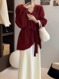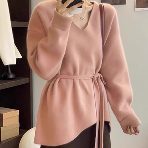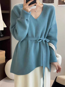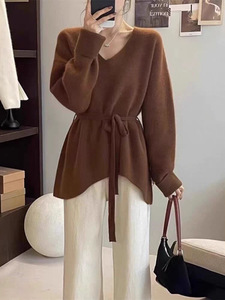 套头长袖V领腰带款气质外套针织衫外搭毛衣女宽松冬季外贸不规则