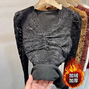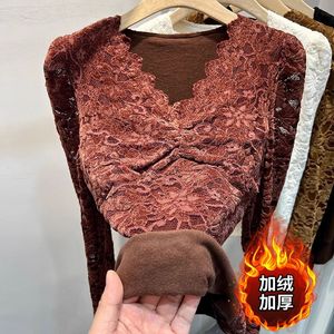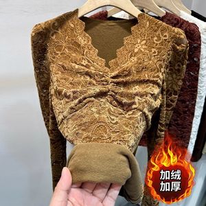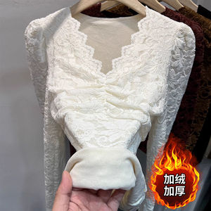 加绒加厚长袖蕾丝衫女2025秋冬新款植绒V领网纱内搭t恤打底衫上衣