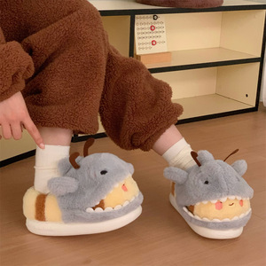 卡通情侣冬季新款可爱鲨鱼蜜蜂毛毛鞋男女趣味包跟鲨bee棉拖鞋