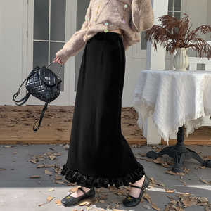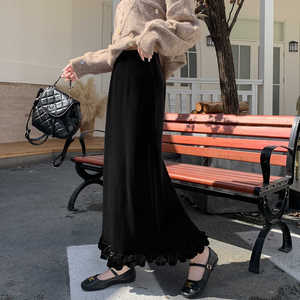 韩版高腰松紧丝绒半身裙女早秋新款设计感下摆双层花边洋气直筒裙