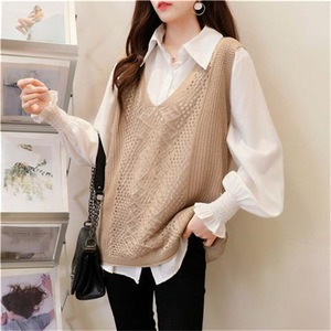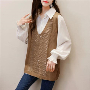 秋季新款韩版简约风马甲女色纺纱镂空针织毛衣外贸宽松坎肩背心潮