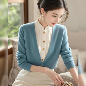 蓝色假两件毛衣2025秋冬新款高级感新中式毛衣气质立领通勤针织衫