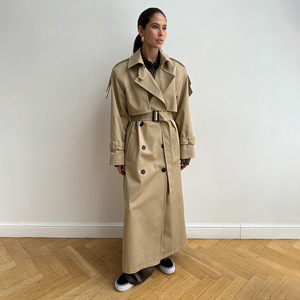 跨境加长款风衣外套欧美2025秋冬纯棉复古宽松外套系带收腰风衣女
