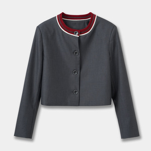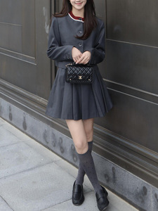 SW撞色毛织圆领外套女25秋季新款宽松箱型上衣百褶半裙灰色套装