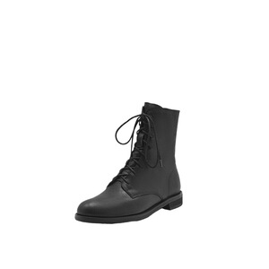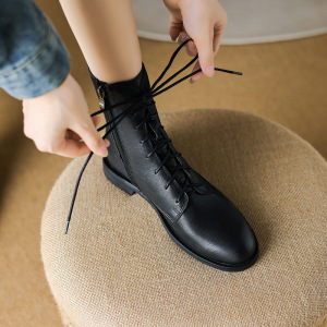 平底马丁靴女2025年秋冬英伦风前系带圆头粗跟软羊皮短靴