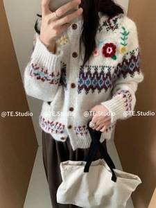 复古费尔岛立体花朵毛衣外套女秋冬季2025新款减龄学院风针织开衫