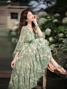 大裙摆春秋约会休闲法式复古绿色碎花连衣裙夏季新款收腰V领长裙