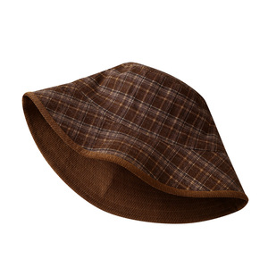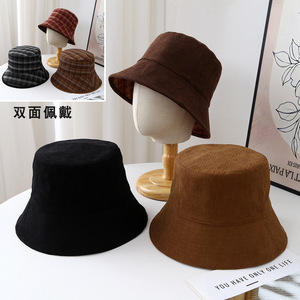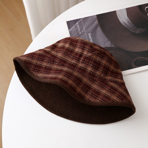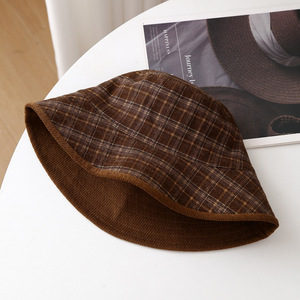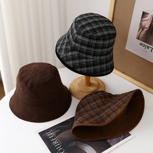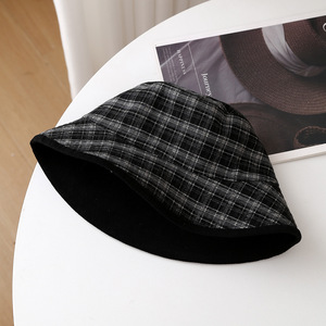 秋冬新款百搭纯色渔夫帽户外洋气格纹双面戴盆帽时尚保暖水桶帽