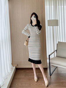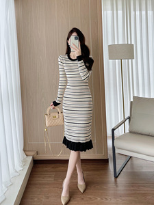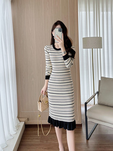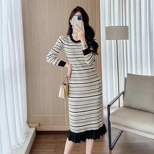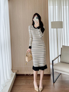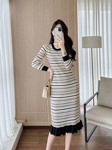 高级感小香风针织连衣裙女秋季木耳边条纹过膝长款包臀毛衣鱼尾裙