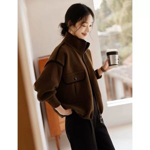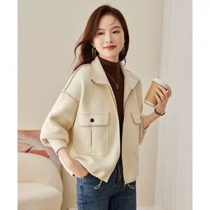 毛呢外套女春秋装2025年新款仿双面呢开衫外套女针织拼接短款上衣