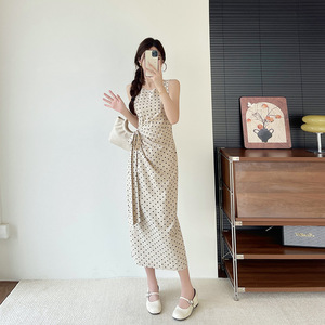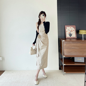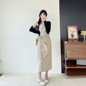 法式气质波点连衣裙子女夏季2025新款高级感绑带收腰显瘦长裙套装