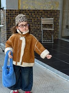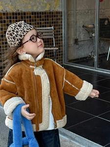 2025冬季新款女童韩洋气麂皮绒闲外套儿童皮毛一体立领机车服