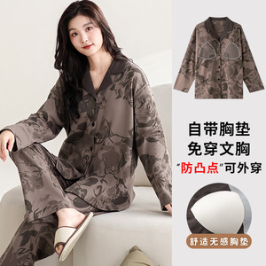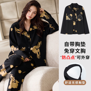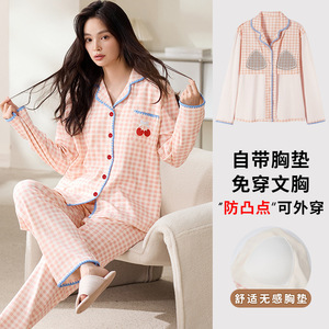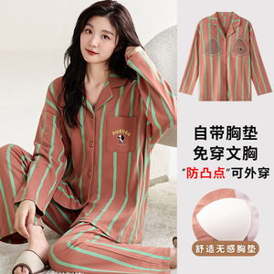 纯棉女士睡衣新款带胸垫长袖长裤秋冬季甜美可爱家居服可外穿套装