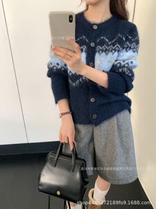 韩系小狗蝴蝶结费尔岛毛衣外套女秋冬新款宽松显瘦小众针织开衫