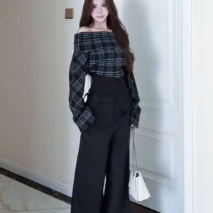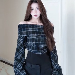 慵懒风黑白撞色简约秋季撞色格纹一字肩收腰长袖上衣长裤秋季套装