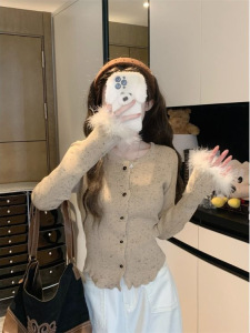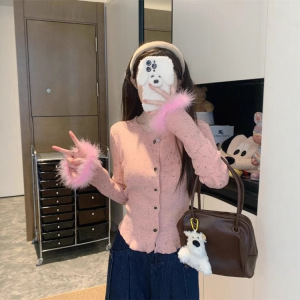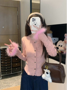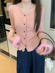 小香风毛绒绒拼接针织开衫女春季新款设计感修身内搭彩点百搭毛衣