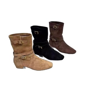 2025韩版新款小众设计复古法式靴子小方头西部靴粗跟马丁靴女靴子