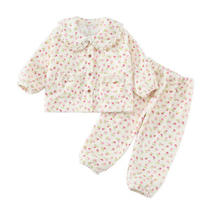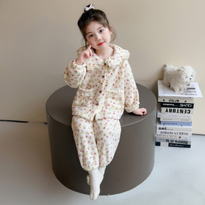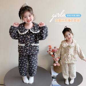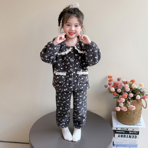 女童睡衣套装2025新款秋冬女宝宝休闲珊瑚绒碎花立领家居服法兰绒