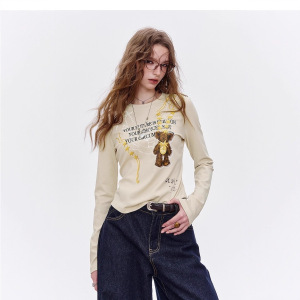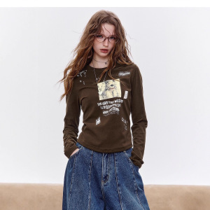 妖精的 复古印花长袖t恤女2025秋新款设计感修身显瘦内搭上衣