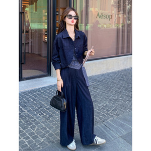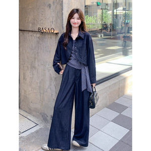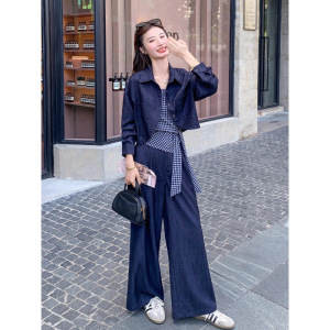 实拍又酷又飒牛仔套装女早秋2025新款高级感格子吊带阔腿裤三件套