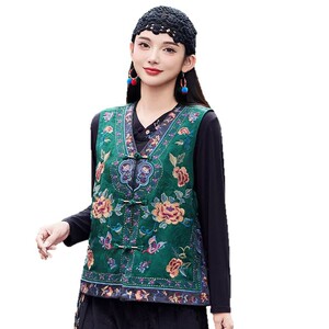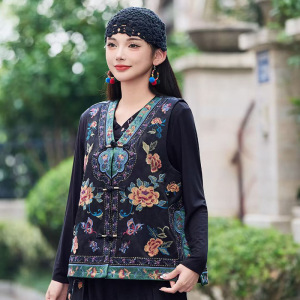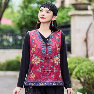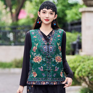2025秋季新款V领复古盘扣拼接无袖马甲撞色民族风刺绣马甲外套女