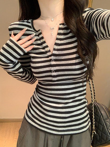 美式复古辣妹条纹亨利领长袖T恤女早秋内搭修身miu系打底衫bm上衣