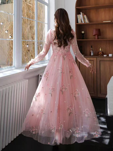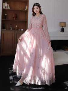 2025春夏新款圆领复古刺绣花朵收腰木耳边网纱礼服长裙连衣裙仙女