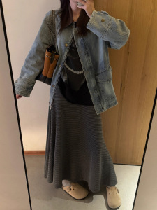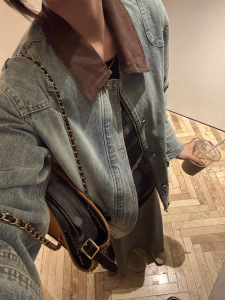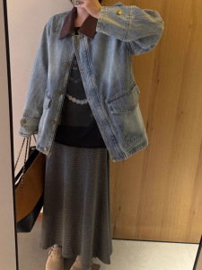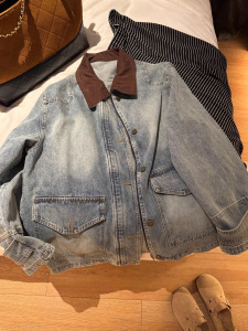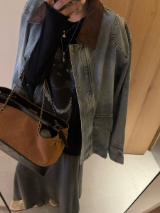 韩系慵懒风时尚经典撞色大版休闲牛仔外套女重工麂皮绒翻领夹克