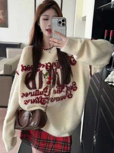 美式复古字母贴布刺绣圆领毛衣男女甜酷宽松慵懒风学生套头针织衫