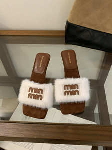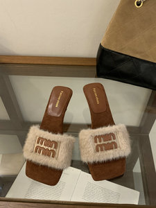 826-5~坡跟法式小香风方头露趾毛毛拖鞋女外穿2025年秋冬季新款