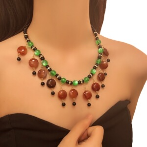 欧美跨境波西米亚猫眼石流苏项链民族风复古小众优雅气质锁骨链女