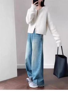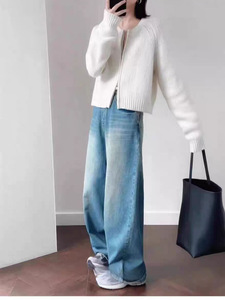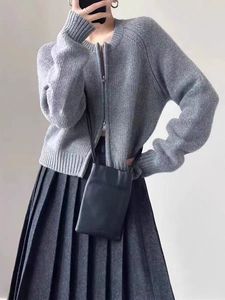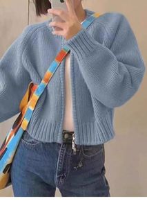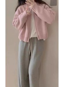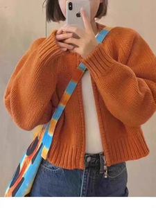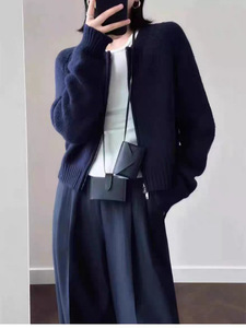 韩系漂亮小上衣纯羊毛衫女士圆领开衫毛衣外套拉链宽松针织外搭