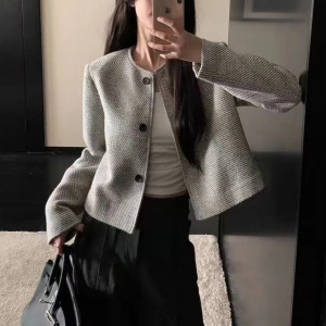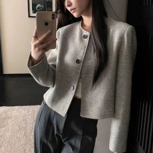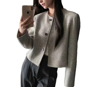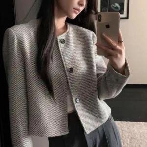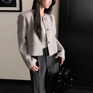 夏蓝汐雨SMBLRAIN复古圆领单排扣上衣女条纹宽松毛呢小香风外套